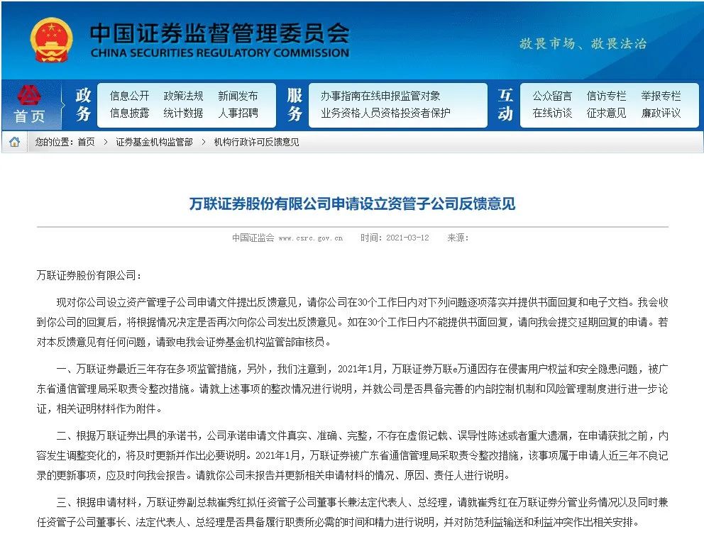 3月12日,证监会官网披露,证券基金机构监管部发布对万联证券设立资管子公司的反馈意见,并要求该券商30个工作日内回复。