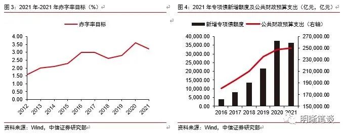 公共预算支出方面,结合两会定调,我们认为2021年公共财政支出结构仍将向民生领域适度倾斜,同时考虑到2021年公共财政预算支出较2020年仅小幅增长,我们认为一般公共财政对基建投资的支持力度可能相对有限。从公共财政的角度看,2020年受疫情影响,公共财政赤字规模明显扩大,但流向基建领域的资金比重相对偏低,具体来看:2020年全年财政支出同比增长2.8%,其中,投向债务付息、社会保障和就业、卫生健康等领域的财政支出同比分别增长16.4%、10.9%、15.2%,与之对比,投向节能环保、城乡社区事务等基建领域的财政资金同比分别下降14.1%、20.0%。考虑到2021年财政草案报告重点指出要“加大对保就业保民生保市场主体的支持力度”、“确保基本民生支出只增不减”,我们认为2021年公共财政的支出结构或仍将适度向民生领域倾斜,同时考虑到2021年公共财政预算支出较去年同期仅小幅增长1.8%,料一般公共财政对基建投资的支持力度可能相对有限,流向基建领域的支出部分同比或难以明显超过2%。