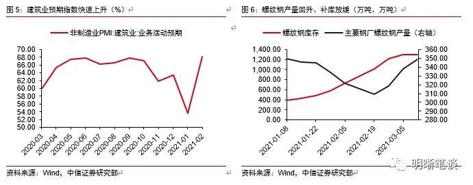 短期视角:基建投资或将阶段性回暖。随着《政府工作报告》与《财政预算草案》双双发布,2021年的财政基调正式确立,同时考虑到去年部分地区已经陆续开展2021年的项目申报工作,预计项目储备并非当前基建投资的主要掣肘,后续财政“有的放矢”料将对近期的基建投资形成一定提振。此外,2月建筑业预期指数明显上行,这也说明当前市场主体对施工进度加速的预期较强,同时考虑到近期螺纹钢产量上行+价格高位+补库放缓,料近期基建投资或有一定的回暖可能。