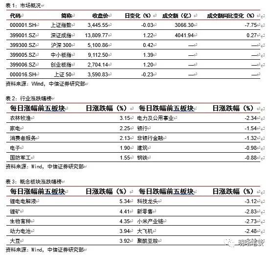 2021年3月17日,银存间质押式回购加权利率大体上行,隔夜、7天、14天、21天和1个月分别变动了-13.14bps、-8.15bps、-16.35bps、10.68bps和-6.91bps至1.99%、2.14%、2.12%、2.62%和2.70%。国债到期收益率全面下行,1年、3年、5年、10年分别变动-2.34bps、-1.76bps、-0.64bps、-0.50bps至2.64%、2.94%、3.06%、3.26%。上证综指下跌-0.03%至3445.55,深证成指上涨1.22%至13809.77,创业板指上涨1.20%至2704.14。