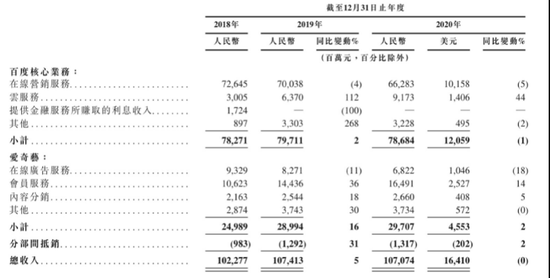 据招股书数据显示,2018年至2020年,百度核心业务中,在线营销收入分别为726.45亿元、700.38亿元、662.83亿元,呈持续下降态势,2019年较2018年同比下降4%,2020年较2019年同比下降5%。