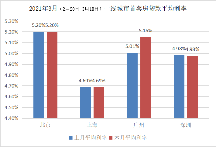 一线城市中,2021年3月,广州地区的房贷利率继续大幅上调,首套房贷款平均利率环比上涨14BP,二套房贷利率环比上涨6BP。而在2月,广州首套房贷利率平均水平环比上涨11BP,二套房贷利率平均水平环比上涨4BP。