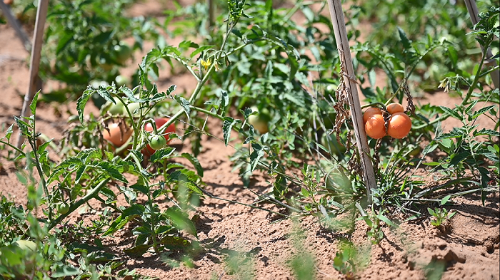 2020年8月26日拍摄的乌兰布和沙漠上的“沙漠土壤化”规模种植试验基地,治理沙地上生长着几十种瓜果蔬菜。记者王雪冰摄