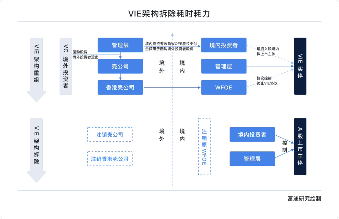 但私有化借壳回归的时间成本比较高,监管风险也比较大。大部分中概股为在海外上市,采用了VIE架构,回归时需要拆除,这其中涉及多方利益,境内境外操作繁琐,耗时耗力。