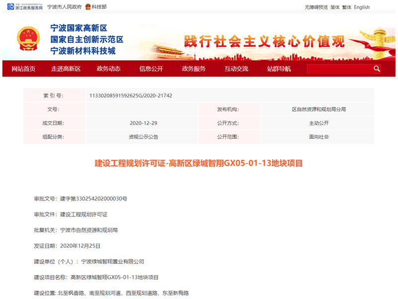 据宁波市政府科技部信息,高新区绿城智翔GX05-01-13地块项目建设单位为宁波绿城智翔置业有限公司,建设位置为北至枫香路、南至规划河道、西至规划道路、东至新梅路,建设规模84295.92平方米。