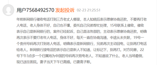 有用户表示,新网银行的暴力催收,导致家人住院、妻离子散。