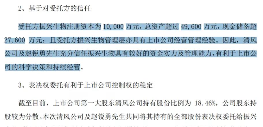 权力更替的局面早已定下。今年2月8日,*ST长动的控股股东浙江清风原生文化有限公司及其一致行动人赵锐勇与振兴生物签署《表决权委托协议》。