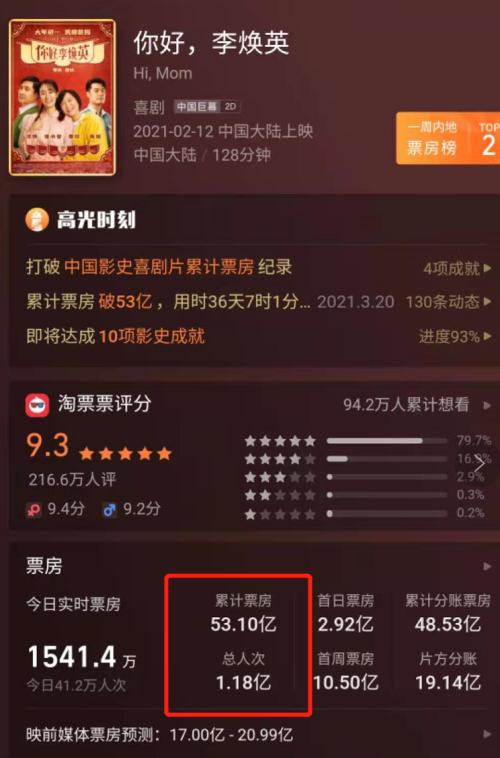 3月6日,《你好,李焕英》总票房超越《哪吒之魔童降世》的50.36亿元,升至中国影史票房第二。目前票房仅次于《战狼2》的56.94亿元。