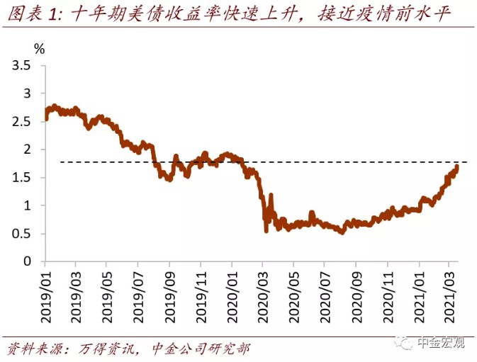 纽约时间3月18日,美国10年期债收益率快速上升并再度突破关键点位,收于1.71%,接近疫情前水平,2月以来美债收益率已经上升近70bp(图表1)。