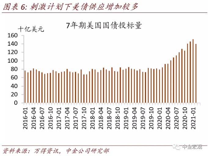 另一个长期因素是,近期拜登刺激计划出台后,美国国债供给量较大。近日7年期国债发行量较大曾是导致债市波动的原因(图表6)。拜登的1.9万亿美元刺激计划也使得市场一致预期未来国债供应将十分充足。