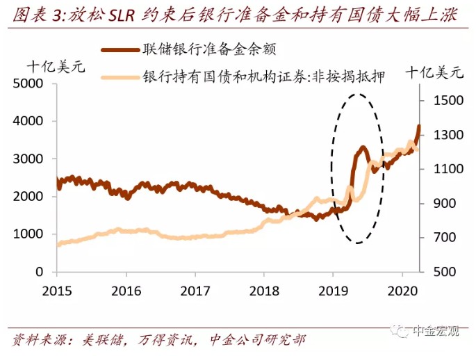 美债周四的波动受技术面因素影响更大。首先是FOMC会议上Powell拒绝对SLR豁免政策延期做表态。SLR是金融危机后美联储用来监管商业银行的资本充足率指标之一,计算公式为一级资本除以总风险敞口(包括国债与准备金),一般要求不低于3%-5%。疫情发生后,美联储无限量宽后商业银行被迫扩表,银行持有国债和准备金快速上升,导致很多银行资本充足率低于要求而不达标,阻碍无限量宽的推行。因此美联储、联邦存款保险公司(FDIC)、通货监理署(OCC)于2020年4月1日联合修改规定放松SLR约束,允许在计算SLR时不把国债和准备金计入分母,有效期至2021年3月31日。此后,联储银行准备金从2020年3月25日的2.35万亿美元快速上升,截至2021年3月10日已经上升至3.65万亿美元;商业银行持有国债和机构债券中非抵押按揭部分从3月25日的0.93万亿美元上升至3月3日的1.21万亿美元。如果该项政策不延期,一些银行可能为了满足资本充足率而抛售国债。过去半个月一级交易商已经减持美国国债807亿美元,其持有额从2月24日的2505亿美元下降至3月10日的1698亿美元(图表4)。