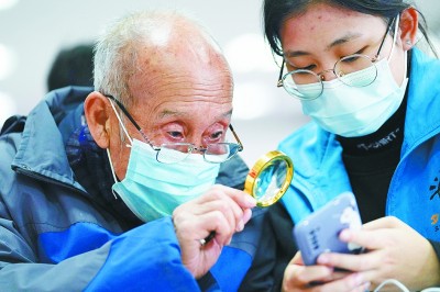 北京外国语大学的志愿者在“科技助老”活动中为老人讲解智能手机使用方法。新华社发