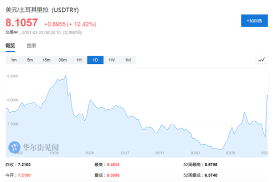 周六,土耳其公告开掉上任仅仅4个月的央行行长Naci Agbal,里拉汇率随后暴跌11%。Naci Agbal曾被视为推动该国货币走出历史低点的关键力量。