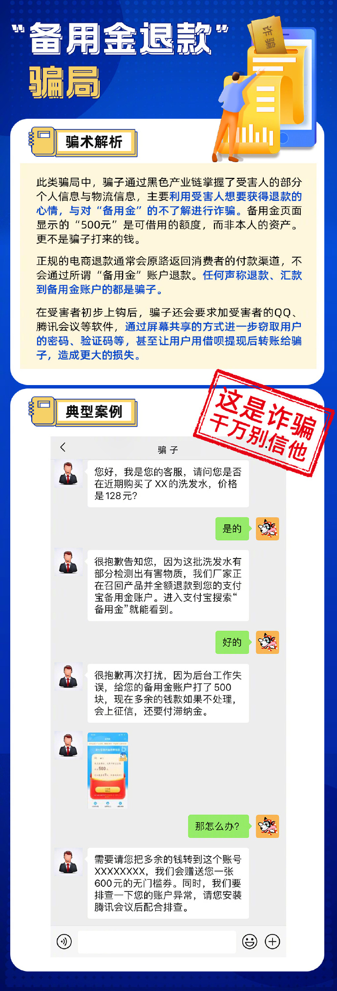 在“备用金退款”骗局中,骗子通过黑色产业链掌握了受害人的部分个人信息和物流信息,主要利用受害人想要获得退款的心情,与对“备用金”的不了解进行诈骗。在受害者初步上钩后,骗子还会要求加受害者的QQ等,通过屏幕共享的方式窃取用户的验证码、密码等,甚至让用户用借呗提现后转账给骗子。