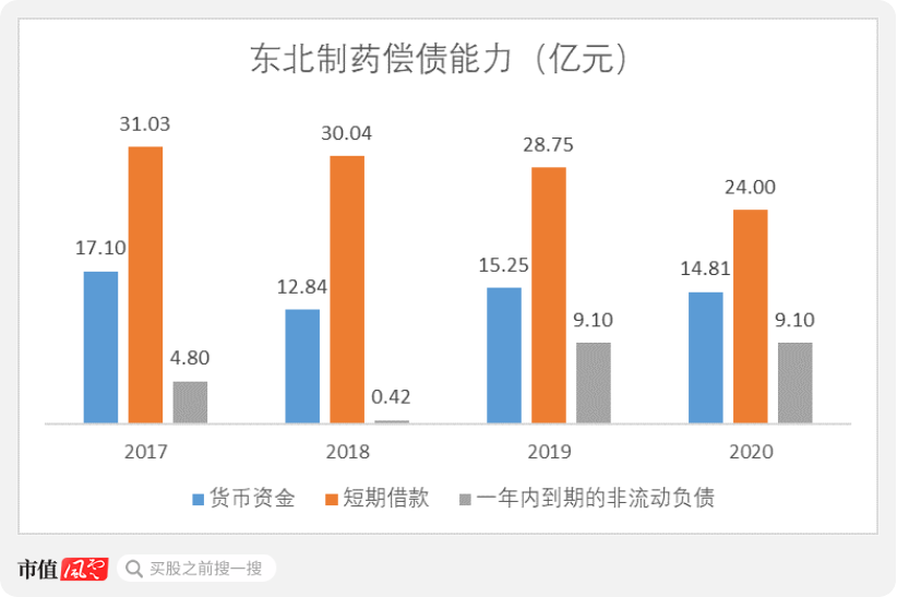 2017-2020年,东北制药的短期借款和一年内到期的非流动负债远高于货币资金,即账面现金不足以偿付到期有息负债。