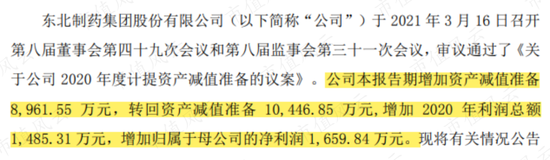 原来,根据2020年度资产减值准备的公告,东北制药转回资产减值准备,使得当年归母净利润增加了0.16亿。否则,就亏了。