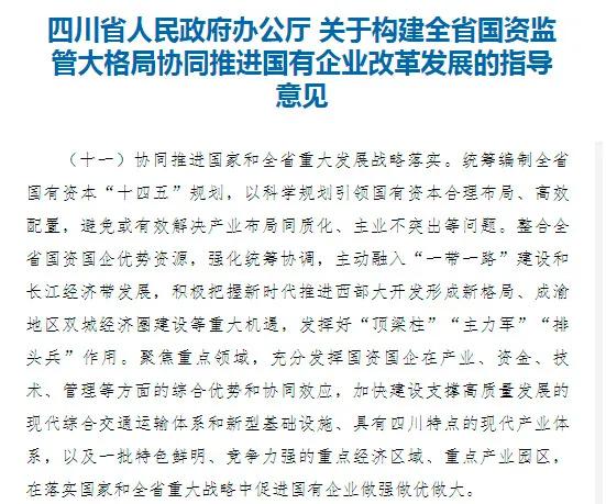 四川省在2019年底提出“构建国资监管大格局、形成国资监管一盘棋”的口号。相关信息显示,四川省政府办公厅在2020年4月发布《关于构建全省国资监管大格局协同推进国有企业改革发展的指导意见》。《指导意见》明确表示,四川要通过国有资本合理布局、高效配置,避免或有效解决产业布局同质化、主业不突出等问题。