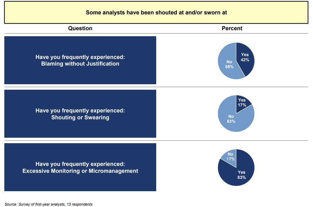大多数接受调查的分析师表示,他们在工作中受到了无端指责,以及“过度监控或管理”。在1-10的打分范围内,受访者对工作和公司的平均满意度为2分。