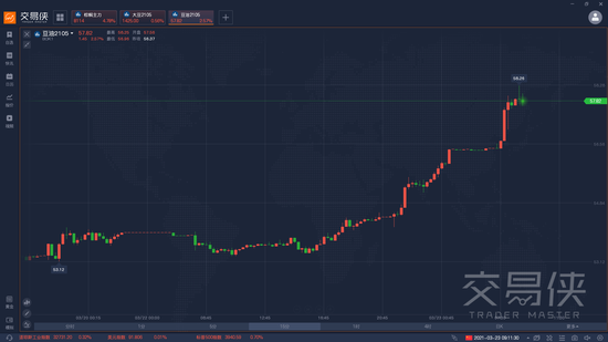 今日凌晨1:43,芝加哥期货交易所(CBOT)5月豆油期货涨停,日内涨2.5美分,报56.37美分/磅。CBOT 5月豆油期货早间开盘延续强势,日内涨超3%,最高报58.26美分/磅。