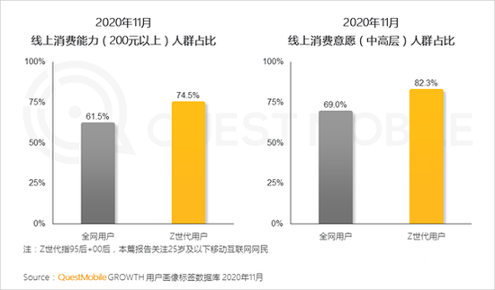 根据QuestMobile数据显示,截止到2020年11月,95、00后Z世代活跃用户规模已经达到3.2亿,占全体移动网民28.1%;从分布上看,一线、新一线、二线城市占比近45%,线上消费能力和意愿均远高于全网用户,线上中高消费能力占比 74.5%。