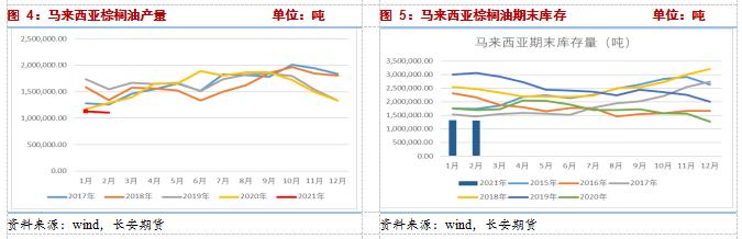 马来西亚棕榈油局(MPOB)本月公布的供需报告数据显示,产量方面,2月为110.559万吨,环比降低1.85%,连续第五个月下滑,产量恢复因天气多雨与疫情导致劳工短缺依然不尽如人意。但同时出口也降至2007年2月以来的最低水平。供需双弱格局下,最终2021年2月底马来西亚棕榈油库存为130.08万吨,环比1月底减少1.8%,创下五年来的最低水平。报告出炉前市场预计2月底库存为142 万吨,低于市场预期,马棕库存的历史低位暂时还没有扭转,成为油脂期价的较强支撑。