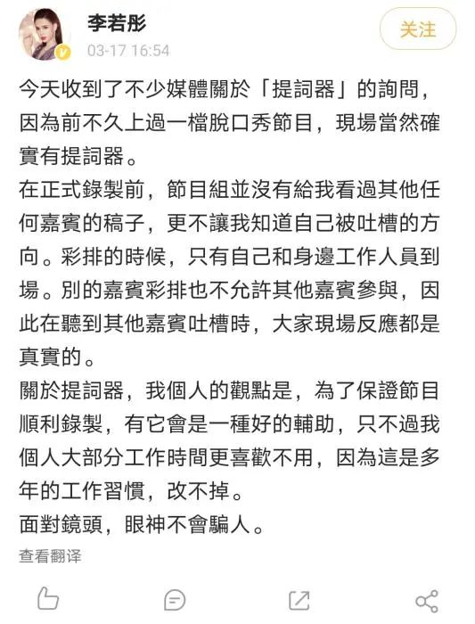 在提词器登上热搜以后,一些参与过节目录制的明星发文回应,当过主咖的演员李若彤说,现场确实有提词器,但在录制前没看过其他嘉宾的稿子,也不知道自己被吐槽的方向,所以现场反应都是真实的。提词器是为了保证节目顺利录制,它是一种很好的辅助,只不过自己大部分工作时间更喜欢不用。