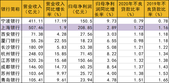 虽然营业收入可观,并实现了营业收入正增长,但在已经披露业绩快报的A股上市城商行中,上海银行营收增速与净利润增速均处于垫底位置。