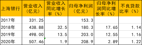 1月8日晚间,上海银行首先发布业绩快报,继2019年业绩增长乏力后,2020年上海银行业绩再次放缓。2020年上海银行营业收入为507.46亿元,同比增1.9%;归母公司股东净利润为208.85亿元,同比增2.89%。