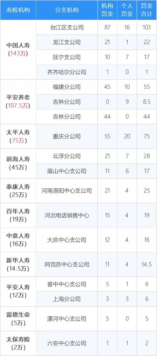 中国人寿福州市台江区支公司由于编制虚假报表、妨碍检查,给予保险合同以外的利益,支公司被罚87万元,主要责任人被罚16万元,合计103万。