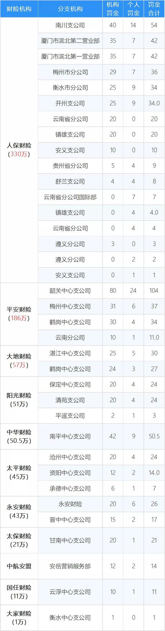平安财险韶关中心支公司由于以虚构保险中介业务的方式套取费用,给予投保人保险合同约定以外的利益,业务财务数据不真实,支公司被罚80万元,负管理责任的个人被罚24万,合计104万。