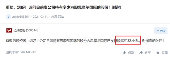 公开消息显示,亿纬锂能3月17日在投资者互动平台表示,公司目前持有思摩尔国际的股份占思摩尔国际已发行股本约32.44%。
