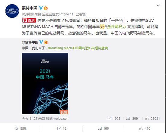 1月28日上午,@福特中国 官方微博发布的广告海报写着“2021 中国·马年”,这个错误马上被发现并引起了网...