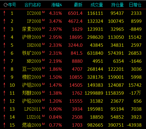 热点栏目7月29日,国内期市收盘多数上涨,期指大涨,IC涨逾4%,IF涨逾3%;有色与黑色系走升,沪锌涨近3%,沪铝、沪铅涨逾1%,铁矿石涨逾2%;能化飘红,尿素涨近3%,橡胶、甲醇涨逾1%;农产品走跌,豆粕、苹果跌近2%,豆一则涨近2%。