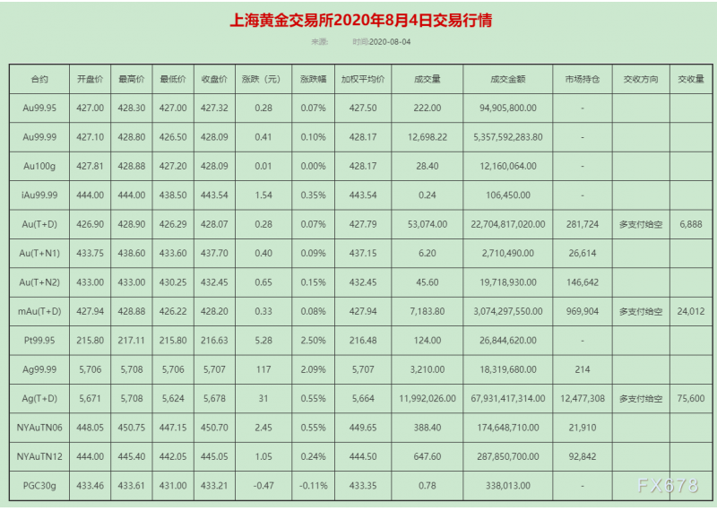 周二(8月4日)黄金T+D收盘上涨0.07%至428.07元/克;白银T+D上涨0.55%至5678元/千克。