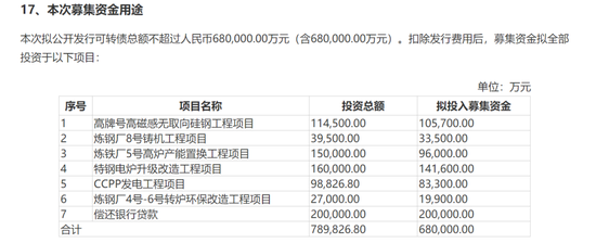 在6月公布的可转债募集说明书中,本钢板材披露的募集资金用途显示,68亿元募集资金扣除发行费用后,20亿元将用于偿还银行贷款,占比最高,其次是用于电炉升级改造项目。