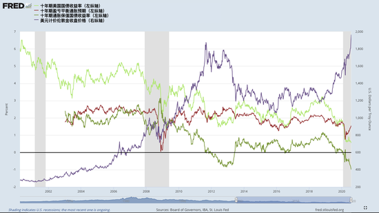 额外附图:金价与十年期/二十年期美国国债收益率、通胀保值收益率和盈亏平衡通胀预期间对比。