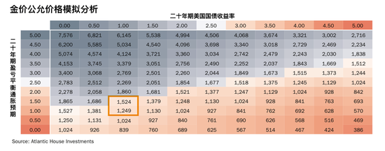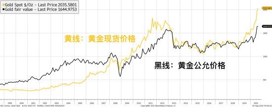 当然,无息票TIPS并不存在,因此仅能从二十年期国债收益率与实际收益率估算价值,再按比例放大后,黄金的公允价值大约在1644美元。目前金价冲到2035美元显示黄金有23%左右的溢价。