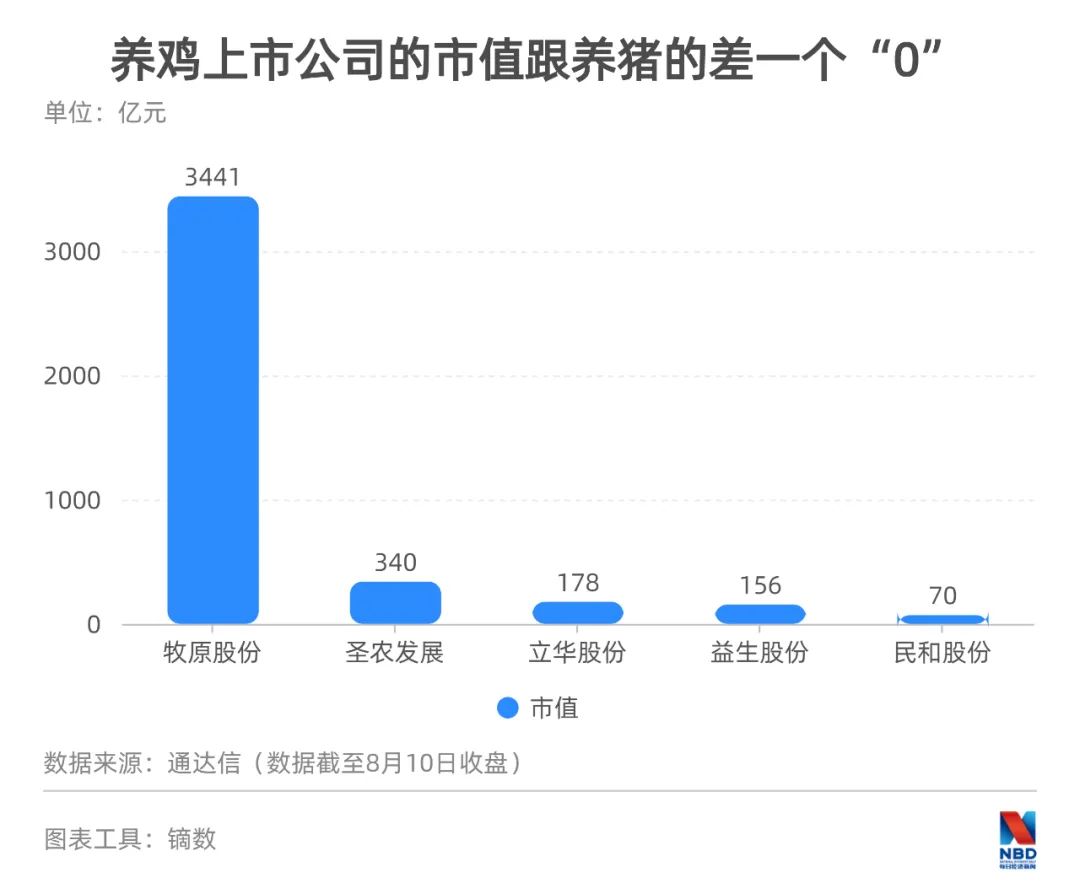 再比市值,同样是养殖,养鸡概念股的市值比养猪的基本上少了一个“0”。