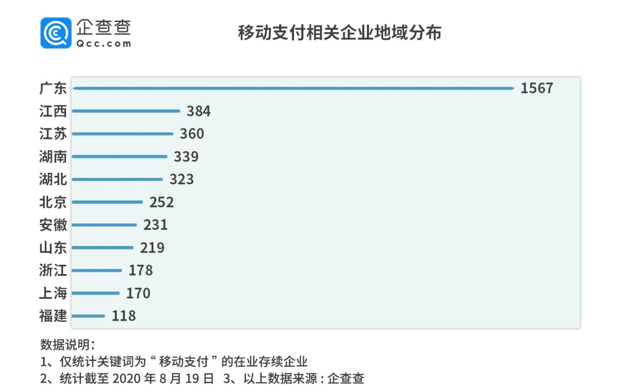 从地域上看,广东是移动支付相关企业数量最多的省份,共1567家企业,远超其他省份,占全国数量的30%,江西、江苏分别以384家、360家排名二三位。整体而言,移动支付相关企业数量前十中,南方省份占据席位较多,北方则仅有北京、山东等地上榜。
