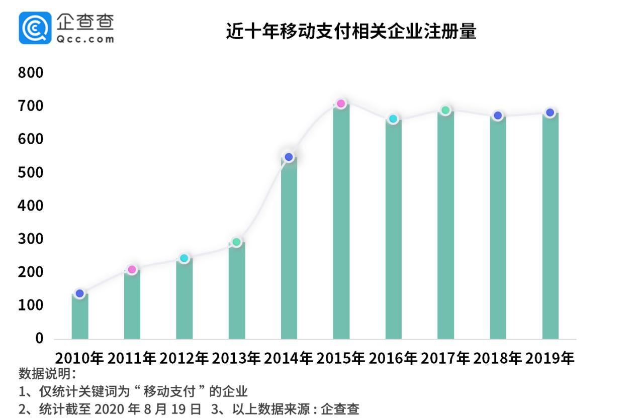 其实变化早在2015年春节就埋下伏笔,这一年全民抢红包、集五福盛行,随后移动支付相继开拓线下消费市场。企查查数据显示,2014年移动支付相关企业注册量迅速攀升,当年新增企业近600家,同比上升88%。随后的5年,即2015-2019年,年均注册量始终保持在700家左右,其中2019年新增682家。