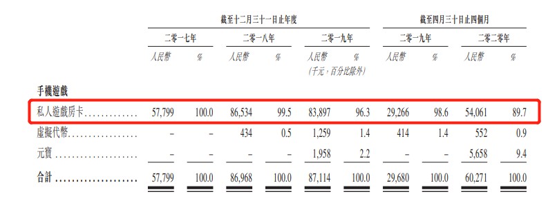 据招股书显示,该公司收入主要来自于虚拟物品的销售和消费,虚拟货物主要包括:私人游戏房卡。其中,私人游戏房卡是最主要的手游变现渠道——2017年至2020年前四个月,收入贡献占比分别为100%、99.5%、96.5%、89.7%。