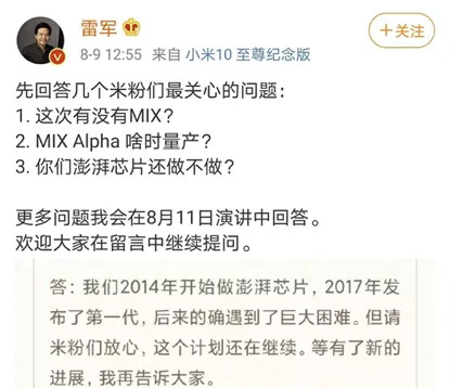 雷军在微博上坦承,澎湃芯片的研发遇到了巨大的困难,但小米自研芯片的道路仍然在继续,“请米粉们放心,这个计划还在继续。等有了新的进展,我再告诉大家。”