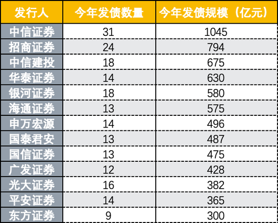 除此之外,华泰证券、银河证券、海通证券今年的发债规模均超过500亿,分别为630亿元、580亿元、575亿;国泰君安、国信证券、广发证券今年的发债规模均超过400亿,分别为487亿元、475亿元、428亿元;而光大证券、平安证券、东方证券的发债规模分别为382亿元、365亿元、300亿元。