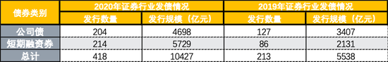 Wind数据显示,截至8月20日,2020年以来券商累计发行债券418只(证券公司债204只、短期融资券214只),同比增长96.24%;累计发行规模10427.26亿元(证券公司债4698.26亿元、短期融资券5729亿元),同比增长88.29%。