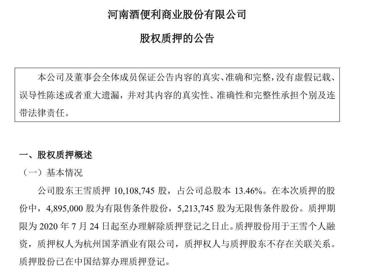 2020年7月28日,酒便利实际控制人王雪更累计质押占公司总股本的30.76%的股份,占其持有公司股份的100%。对此,光大证券发出风险提示公告称,酒便利实际控制人所质押股份用于为公司借款提供担保、实际控制人王雪个人融资。若在质股份被行权,可能存在公司控股股东、实际控制人发生变更的风险。