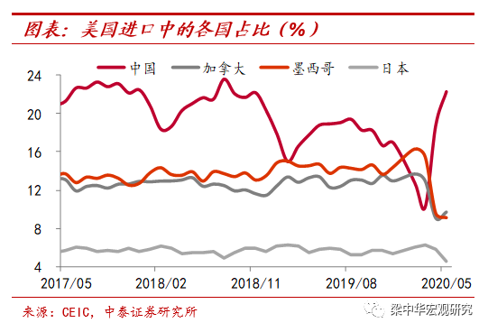 而我国短期出口数据在全球一枝独秀,很大程度来自供应端的因素。我国和海外的疫情错位,海外供应链受到冲击较大,部分订单是转向我国生产的。所以就会发现我国的出口增速远远好于其他经济体,在欧美进口中的占比也大幅飙升。如果后续海外供应链恢复,这部分增加的需求会趋于下降,再加上医疗物资的出口也会有回落的压力。所以往前看,即使海外需求缓慢恢复,我国出口的修复程度可能也会比较有限。