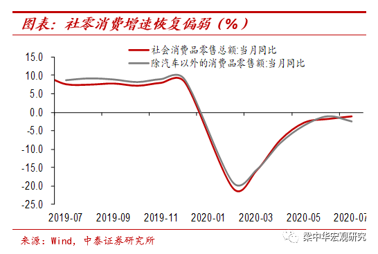 从需求端来看,恢复已经进入瓶颈期。7月社会消费品零售总额增速仅仅从6月的-1.8%回升至-1.1%,不仅继续保持负增长,而且恢复速度有所放缓。剔除汽车后,7月消费品零售增速反而下滑至-2.4%。7月服务业生产指数增速也仅仅回升至3.5%,和疫情之前7%附近的增速还有很大差距。