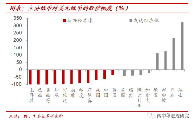 其它纸币的贬值幅度更大。1971年以来,土耳其、巴西、墨西哥、印尼、阿根廷、南非等新兴经济体的货币,仅仅对美元的贬值幅度都有90%以上,对黄金的贬值幅度那就更多了;印度、菲律宾、韩国、中国货币对美元的贬值幅度也有50%以上。