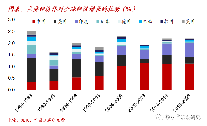 在2000年之前,美国是全球经济增长的主要贡献者,例如80-90年代全球1/4以上的经济增长是由美国贡献的。而2000年之后,中国对全球经济增长的边际贡献逐渐超过了美国,全球1/3的经济增长是来自中国的强大贡献。尤其是08年之后,这一趋势非常凸显。如果中国经济走弱,全球经济恐怕也是一种弱复苏的状态。