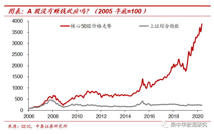 股市中的核心资产也是‘类黄金’。从2006年开始算,上证综指在14年时间中只上涨了1.4倍,但是如果我们将A股中最核心的50只股票选出来,在14年时间里上涨了38倍,远远超过了大盘走势。每次系统性大跌导致的优质个股的回调,都是长期加仓买入的机会。这是因为这些核心资产也具有‘黄金’属性:好公司相对稀缺;长期、或者至少在可预见的未来能够活下来。